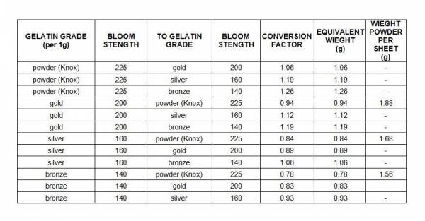• Bronze Gelatin leaves have a bloom strength of 125 and weigh 3.3 grams.